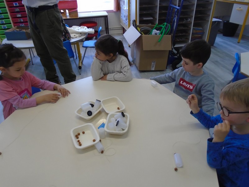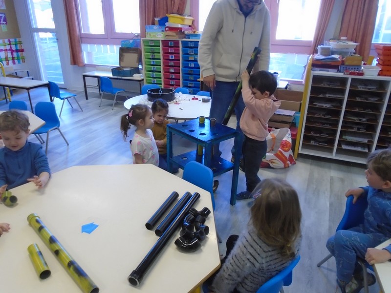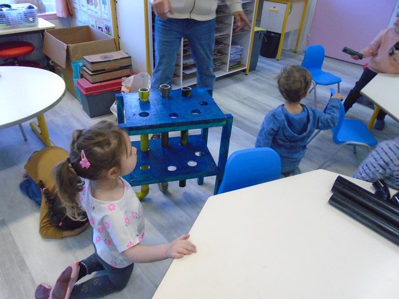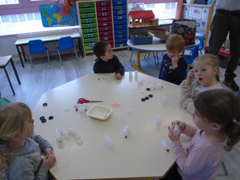 C’est ce principe que nous allons utiliser pour fabriquer une partie de notre œuvre : le « tubophone ». Nous réalisons également un carillon à partir de ficelle, de perles en bois et de vieilles boîtes de pellicules photos.