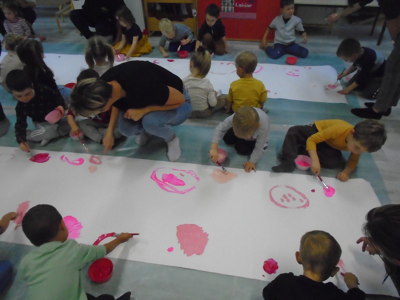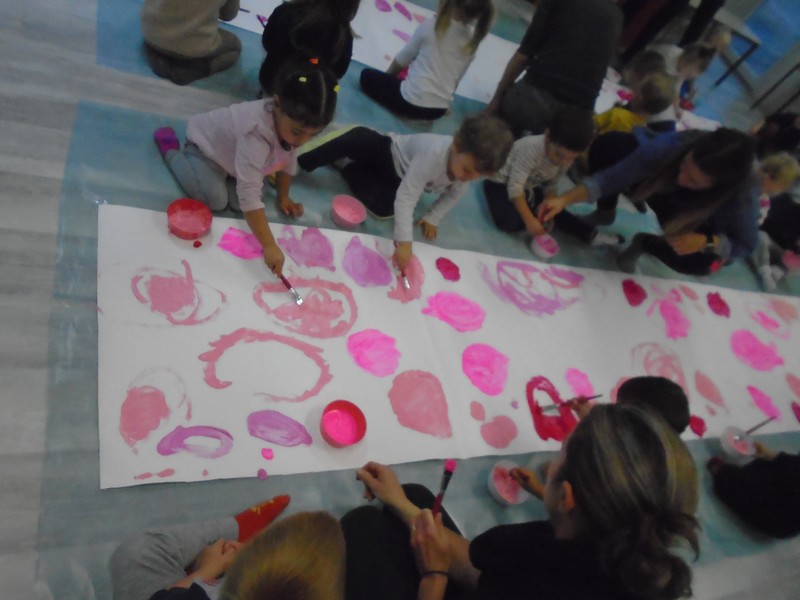 Notre classe rose a réalisé une production dans les camaïeux de rose ; les classes jaune, verte et bleue dans un camaïeu de leur couleur.