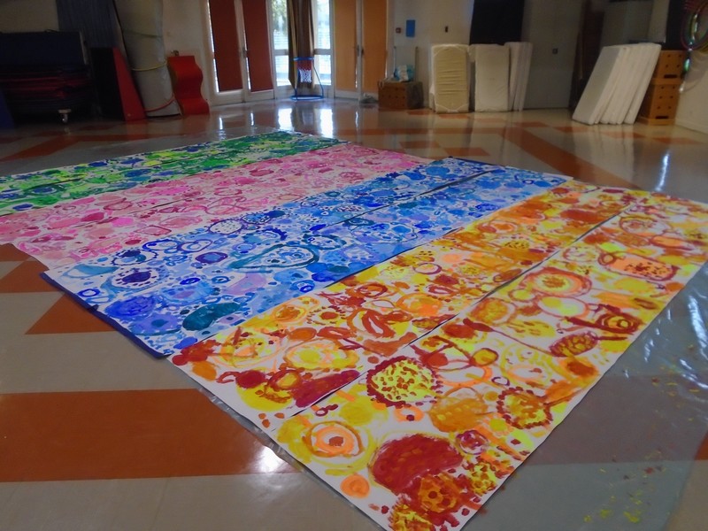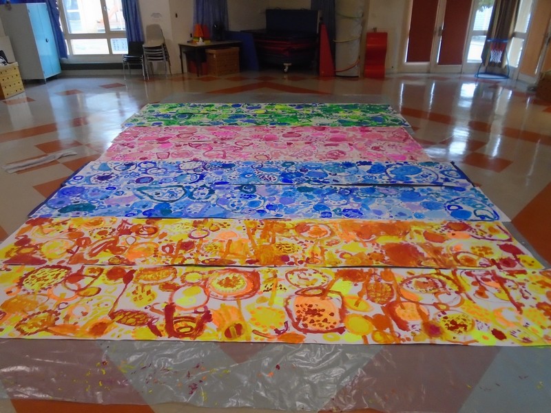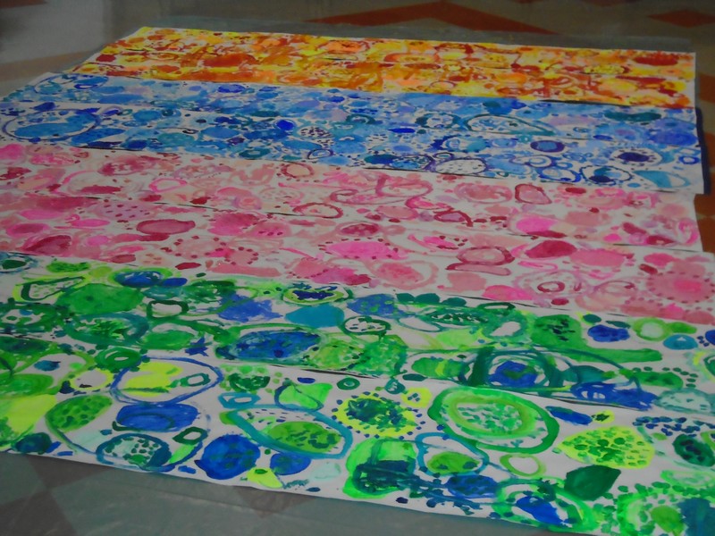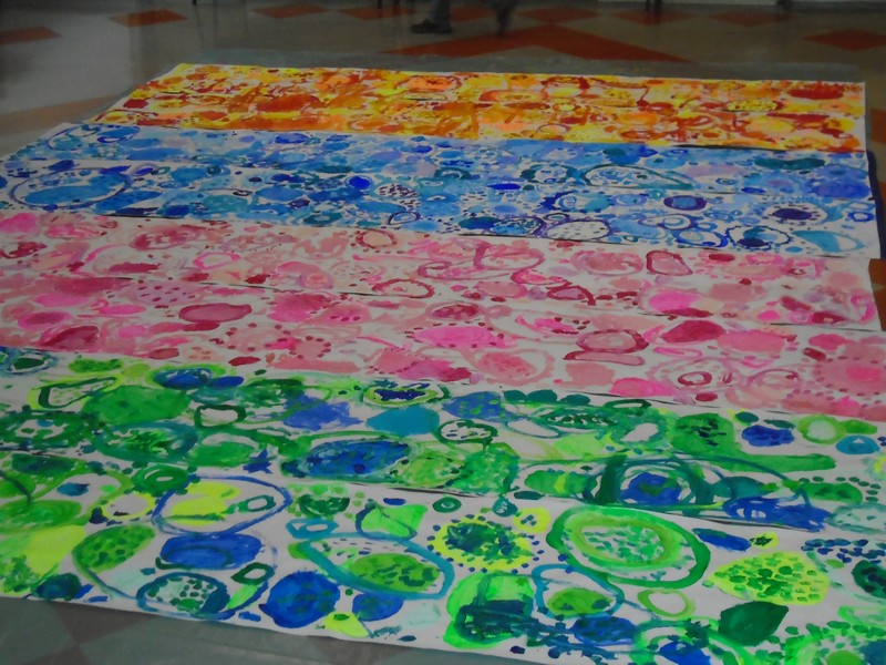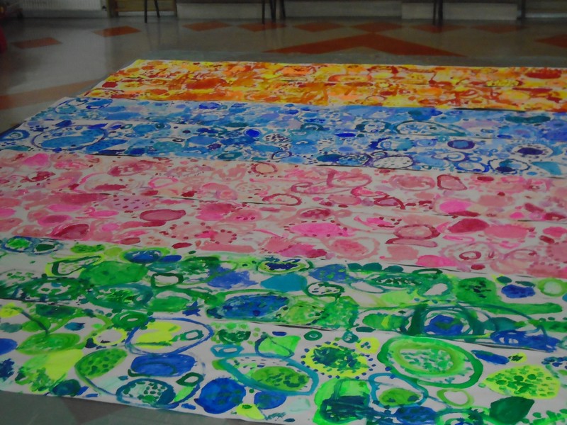 Equipés de notre pinceau et de notre bol de peinture, nous avons dessiné sous les consignes d'Hervé des ronds et des points de différentes tailles sur de grandes bandes de papier. Nous avons tourné autour de notre fresque au fil de sa création et notre champ de fleurs a pris forme petit à petit !